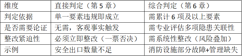 无需组合:违反任一直接判定要素(第5章),立即认定为重大火灾隐患。