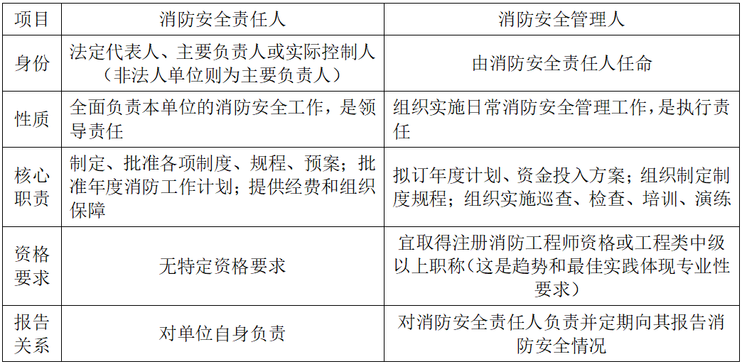2. 消防安全责任人 vs 消防安全管理人