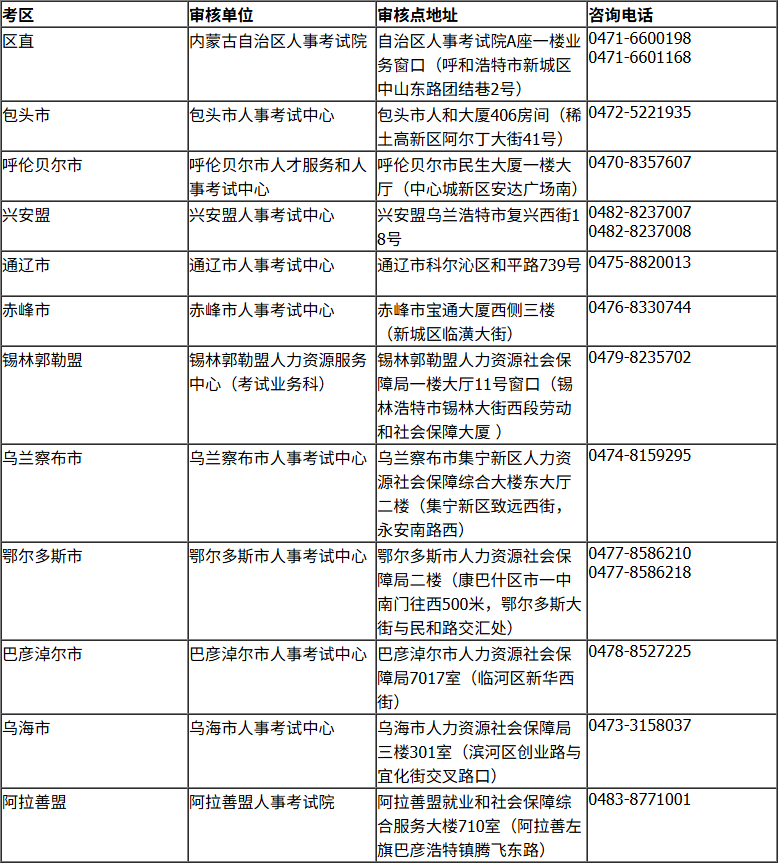 自治区及各盟市人事考试机构资格审核地址、咨询电话