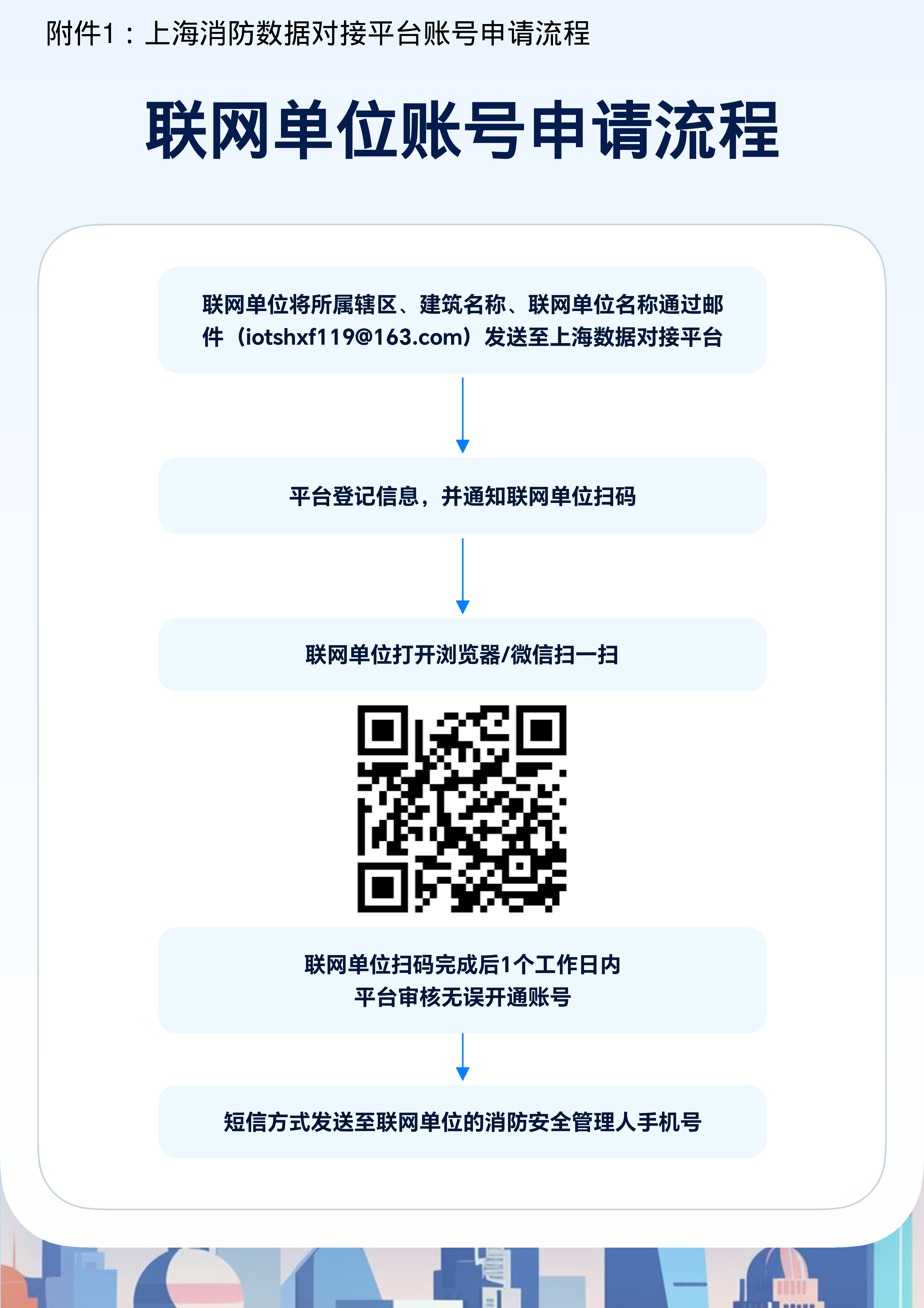 各单位登录上海消防数据对接平台(http://iot.shxf-119.com/)申请账号(见附件1),按照《社会单位-用户手册》步骤,将本单位管理建筑的消防设施物联网系统数据接入平台。