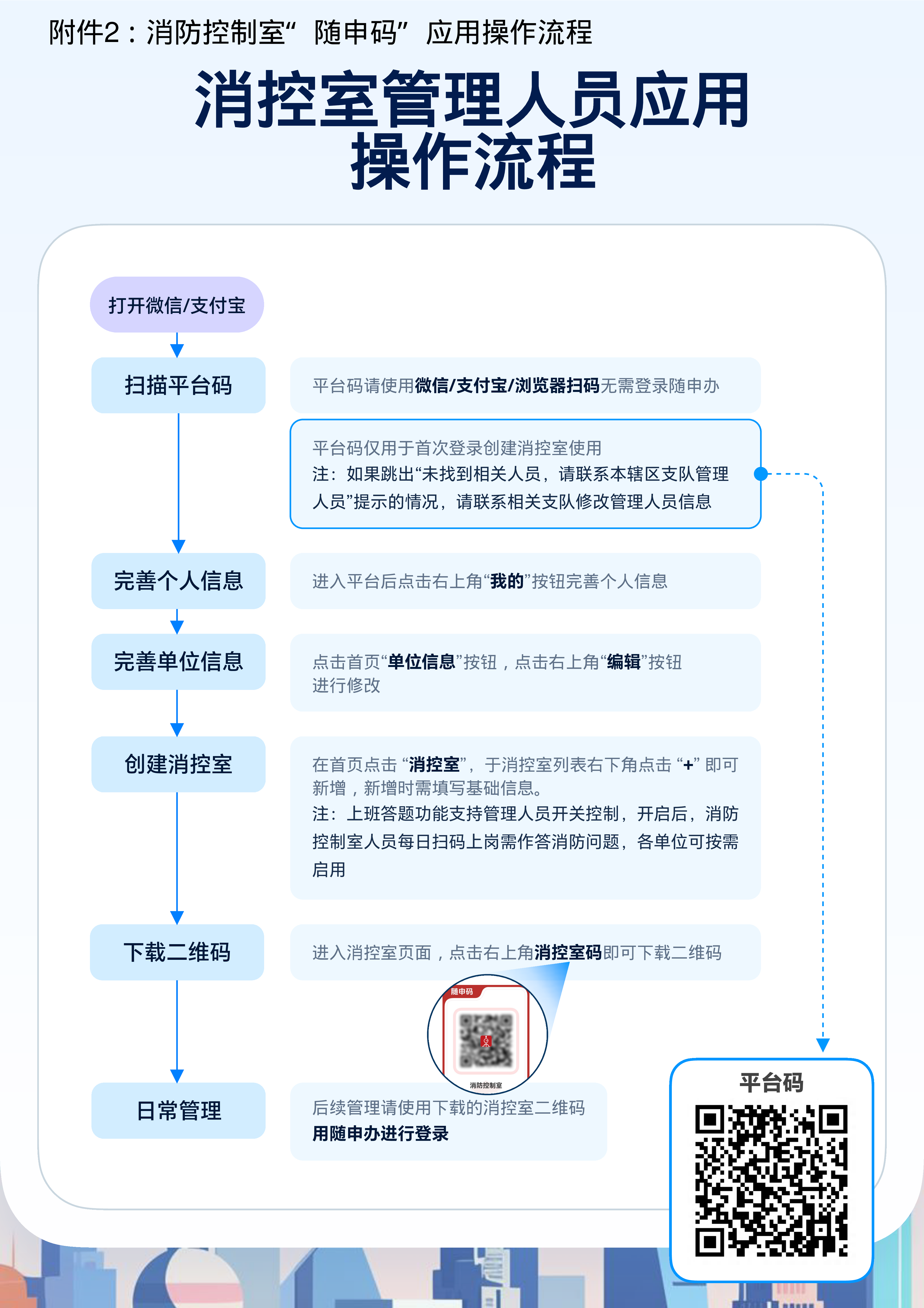 各单位管理人员、值班人员运用上海一网通办移动端政务服务平台——“随申办”平台,根据消防控制室“随申码”操作流程进行日常管理、值班记录(见附件2)。